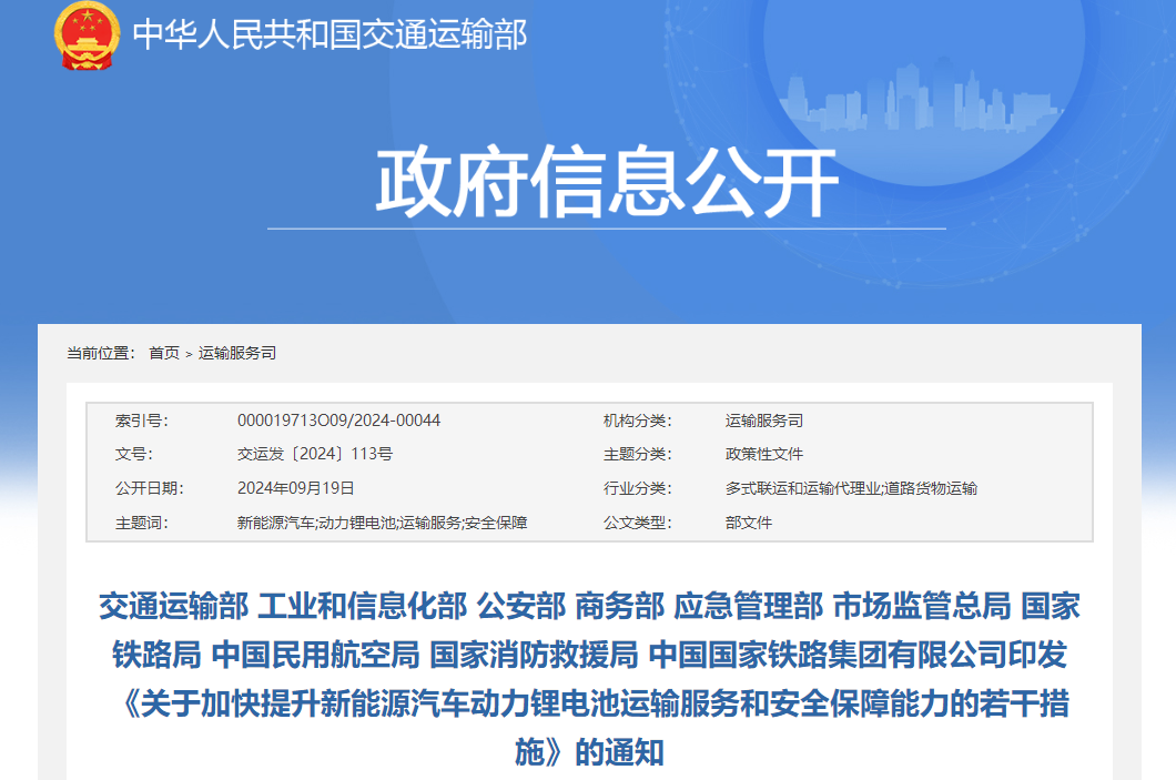 2024年9月19日,交通运输部会同工业和信息化部、公安部、商务部、应急管理部、市场监管总局、国家铁路局、中国民用航空局、国家消防救援局、中国国家铁路集团有限公司等9个部门和单位联合印发《关于加快提升新能源汽车动力锂电池运输服务和安全保障能力的若干措施》,《若干措施》明确了主要任务: