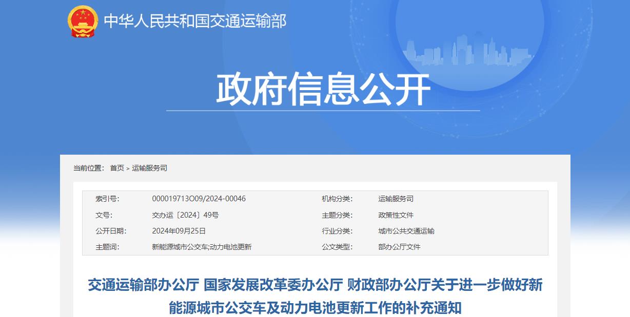 2024年9月25日,交通运输部办公厅、国家发展改革委办公厅、财政部办公厅联合发布《关于进一步做好新能源城市公交车及动力电池更新工作的补充通知》,《通知》明确: