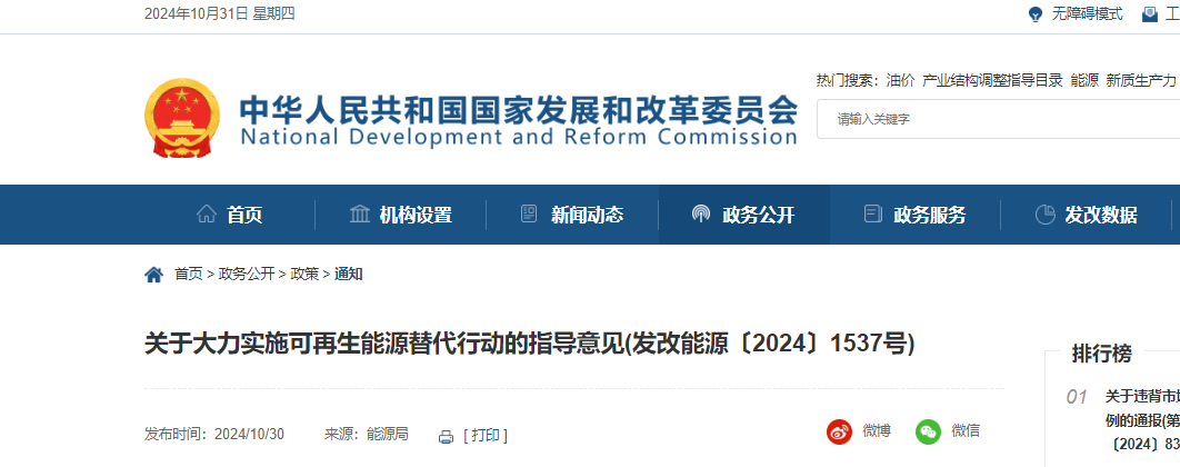 2024年10月30日,国家发展改革委、工业和信息化部、住房城乡建设部、交通运输部、国家能源局、国家数据局联合发布《关于大力实施可再生能源替代行动的指导意见》,《指导意见》明确: