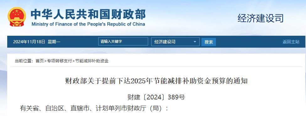 财政部关于提前下达2025年节能减排补助资金预算的通知