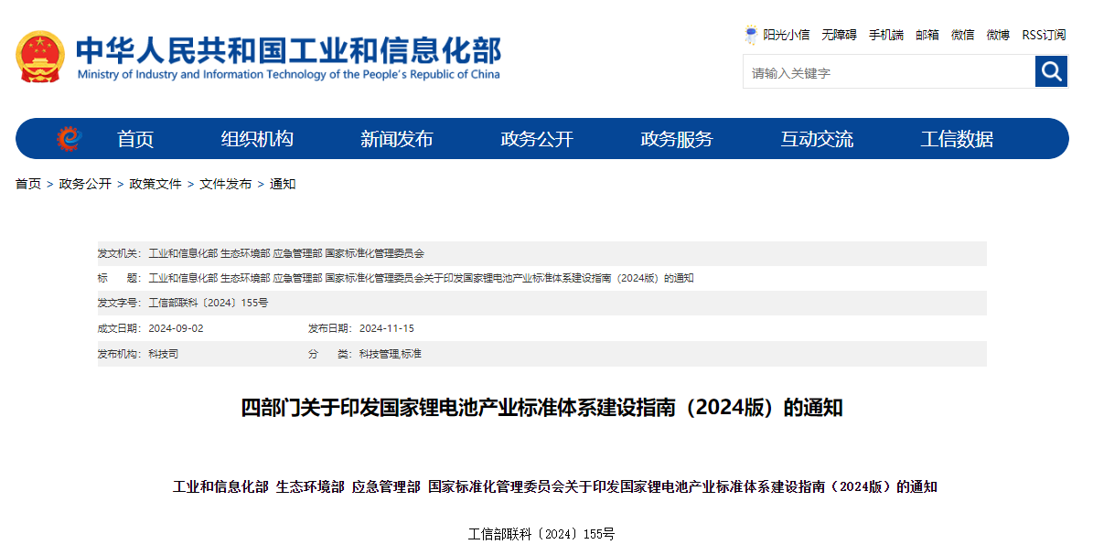 四部门关于印发国家锂电池产业标准体系建设指南(2024版)的通知