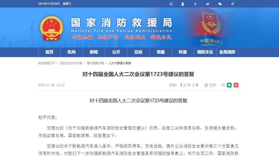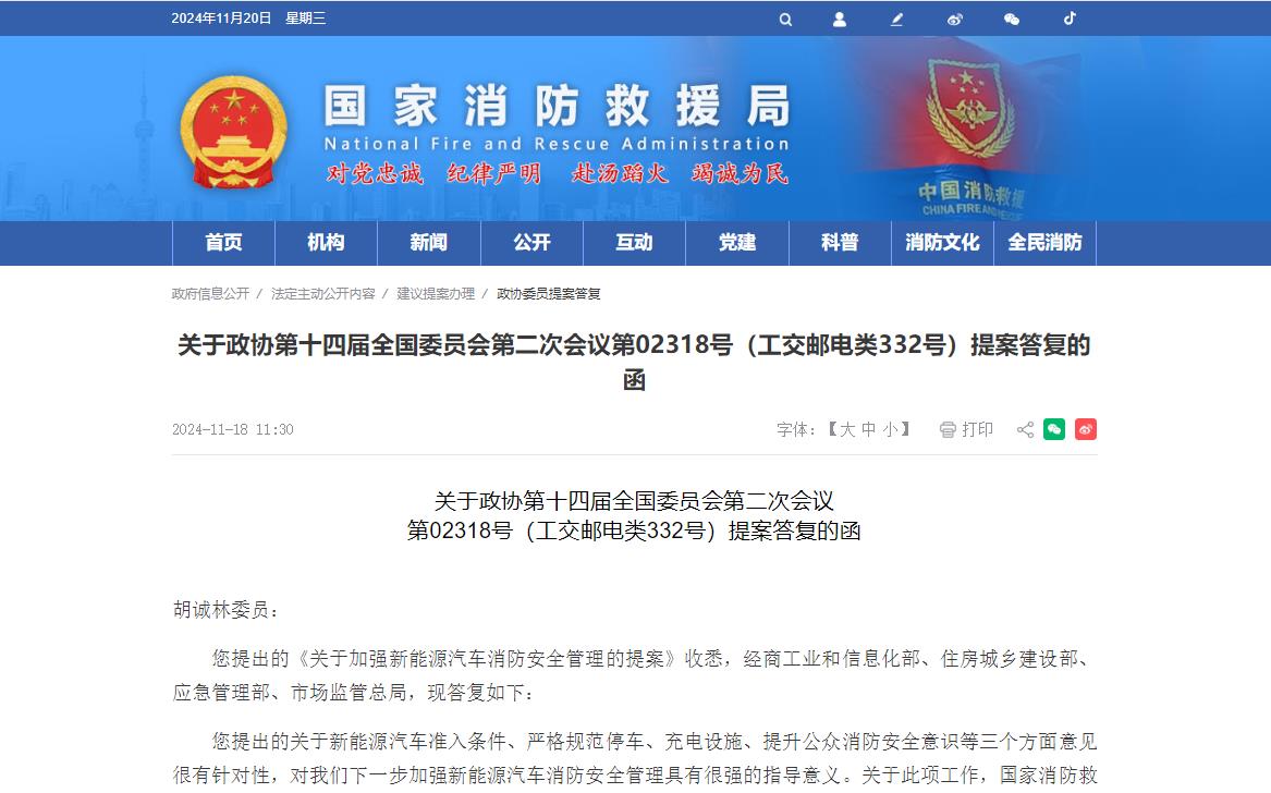 2024年11月18日,国家消防救援局对全国人大代表赵平《关于加强新能源汽车消防安全管理的建议》、全国政协代表《关于加强新能源汽车消防安全管理的提案》做了答复。