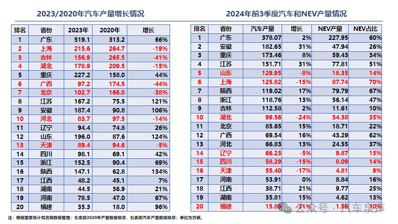 汽车产业新旧动能转换正在对汽车产业空间布局产生重大影响。根据国家统计局数据,2020年汽车产量排名前10省份,2023年有6个省份下降(下降14~44%),4个省份增长(44~121%)。