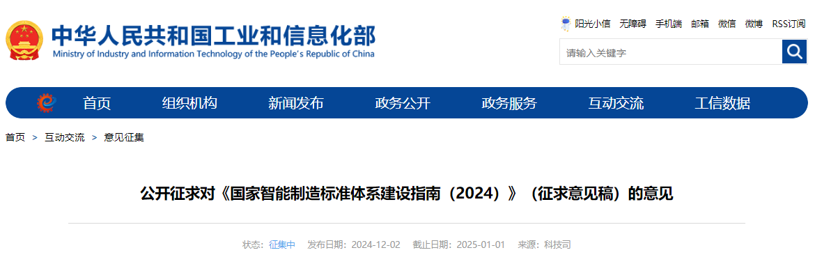 现公开征求社会各界意见,如有意见或建议,请于2025年1月1日前填写《征求意见反馈信息表》(附件2)发送至KJBZ@miit.gov.cn(邮件主题注明:国家智能制造标准体系建设指南征求意见反馈)。