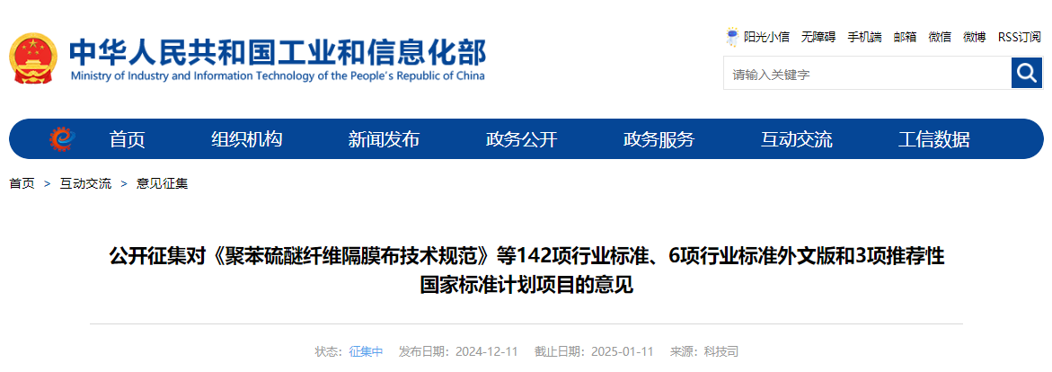 1.《聚苯硫醚纤维隔膜布技术规范》等142项行业标准制修订计划(征求意见稿)