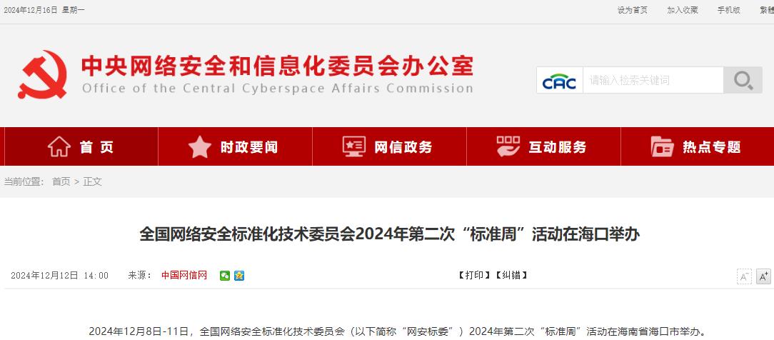 2024年12月12日,中央网信办副主任、国家网信办副主任、网安标委主任委员王京涛在海南省海口市举办的2024年第二次“标准周”活动上指出,站在新起点、新征程,网安标委要深入学习贯彻习近平总书记关于网络安全工作的重要指示批示精神和党的二十届三中全会精神,扎实做好网络安全标准化工作。