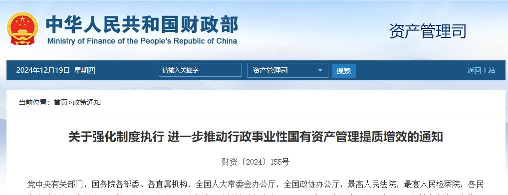 近年来,为有效保障各级各类行政事业单位全面贯彻落实党中央决策部署,财政部不断健全资产管理制度体系,制定了资产配置、使用、处置管理等系列办法,构建了从入口到出口的全链条资产管理制度体系,着力夯实工作基础,全面提升管理水平。各地方、各部门,以及各行政事业单位(以下简称各单位)扎实推进行政事业性国有资产管理(以下简称资产管理)工作,为保障行政事业单位高效履职,促进事业发展,推进各项改革发挥了重要物质保障作用。行政事业性国有资产涉及面广、类型多样、情况复杂,实际工作中还存在部分单位重视程度不高、制度执行和责任落实不到位、规范管理主动性不强等问题。为更好落实党中央关于加强财政资源统筹等部署要求,全面强化制度执行,推动资产管理提质增效,根据《行政事业性国有资产管理条例》等制度规定,现就有关事项通知如下: