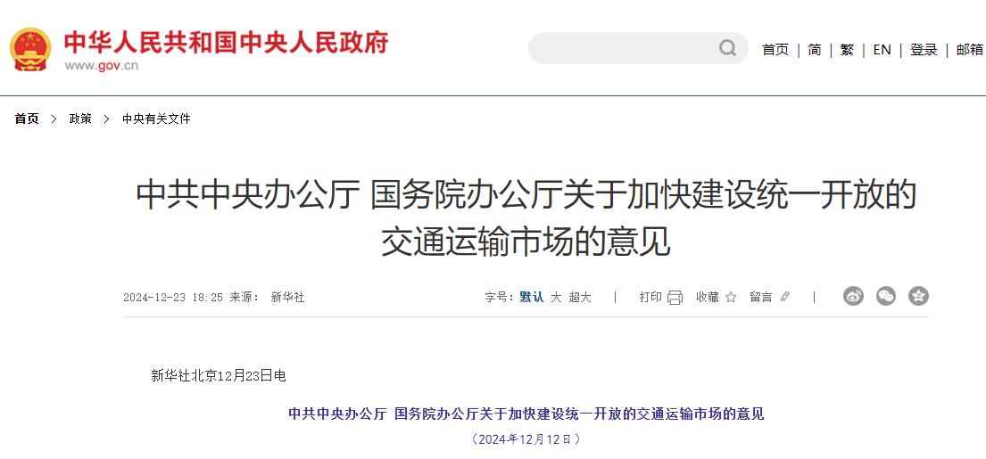 2024年12月23日,中共中央办公厅 国务院办公厅印发《关于加快建设统一开放的交通运输市场的意见》,《意见》明确:推动交通运输绿色智慧转型升级。按规定开展交通基础设施规划和建设项目环境影响评价,保障规划实施与生态保护要求相一致,强化交通运输能耗与碳排放数据共享。完善交通运输装备能源清洁替代政策,推动中重型卡车、船舶等运输工具应用新能源、清洁能源。加快调整优化交通运输结构,深入推进城市绿色货运配送发展。持续实施自动驾驶、智能航运等智能交通先导应用试点。