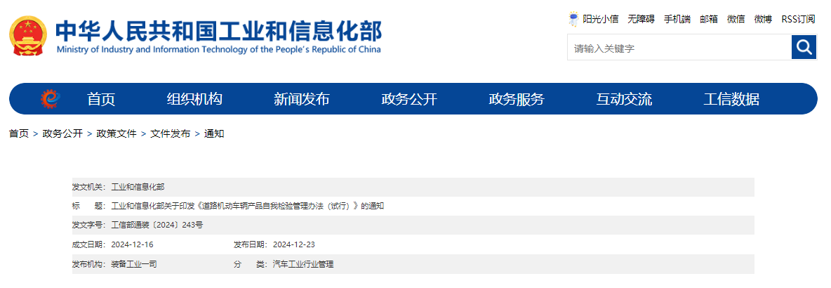 2024年12月23日,工业和信息化部发布《道路机动车辆产品自我检验管理办法(试行)》,《管理办法》明确: