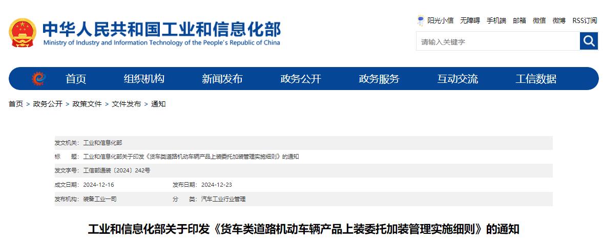 2024年12月23日,工业和信息化部发布《货车类道路机动车辆产品上装委托加装管理实施细则》,《细则》明确: