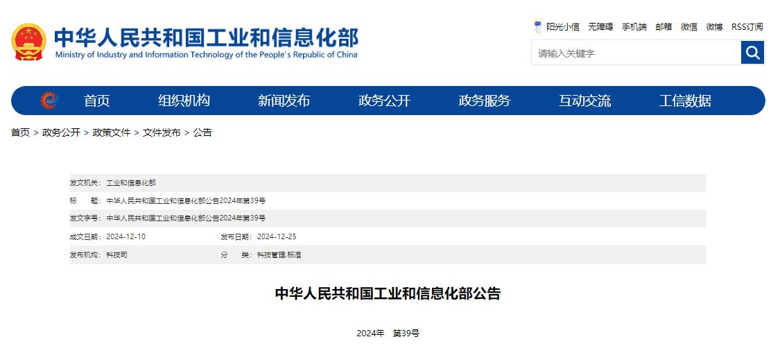 2024年12月25日,工业和信息化部发布2024年第39号公告,批准《移动智能终端卫星定位能力技术要求和测试方法》等486项行业标准。其中,与汽车、氢燃料电池、锂离子动力电池相关的行业标准分别是:基于移动互联网的汽车用户数据应用与保护评估方法、面向车载信息服务的电信业务能力开放要求、智能手机与车载终端互联接口技术要求及测试方法;通信用氢燃料电池供电系统;锂离子动力蓄电池制造业绿色工厂评价要求。这几项行业标准实施日期均为2025年4月1日。