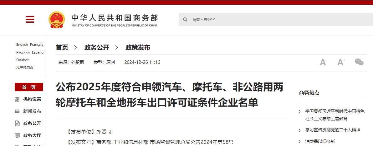 为做好汽车、摩托车产品出口许可证管理工作,根据商务部、工业和信息化部、海关总署、原质检总局、原国家认监委《关于进一步规范汽车和摩托车产品出口秩序的通知》(商产发〔2012〕318号),商务部、工业和信息化部、市场监管总局确认了2025年度符合申领汽车和摩托车产品出口许可证条件的企业名单,现予以公布。