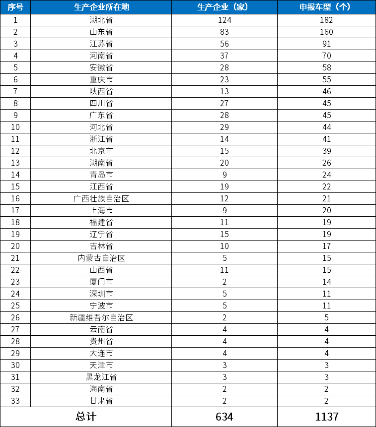 2024年12月26日,商务部、工业和信息化部、市场监督管理总局联合发布2024年第58号公告,确认了2025年度符合申领汽车产品出口许可证条件的企业名单。经统计,2025年度符合申领汽车出口许可证条件的企业名单共涉及33个地区,北汽福田、陕汽集团、一汽解放青岛汽车、庆铃汽车、北奔重汽、安徽江淮汽车、中国一汽、东风商用车、宇通客车等634家生产企业,申报车型共计1137个。