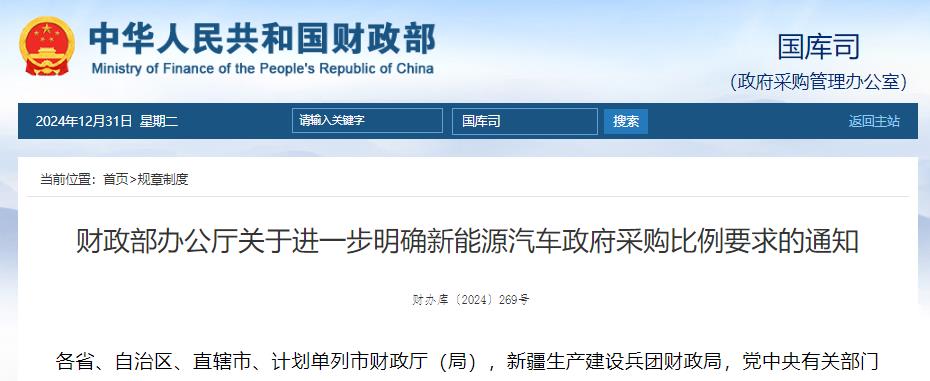 2024年12月30日,财政部办公厅发布《关于进一步明确新能源汽车政府采购比例要求的通知》,《通知》明确:主管预算单位应当统筹确定本部门(含所属预算单位)年度新能源汽车政府采购比例,新能源汽车可以满足实际使用需要的,年度公务用车采购总量中新能源汽车占比原则上不低于30%。其中,对于路线相对固定、使用场景单一、主要在城区行驶的机要通信等公务用车,原则上100%采购新能源汽车。采购车辆租赁服务的,应当优先租赁使用新能源汽车。