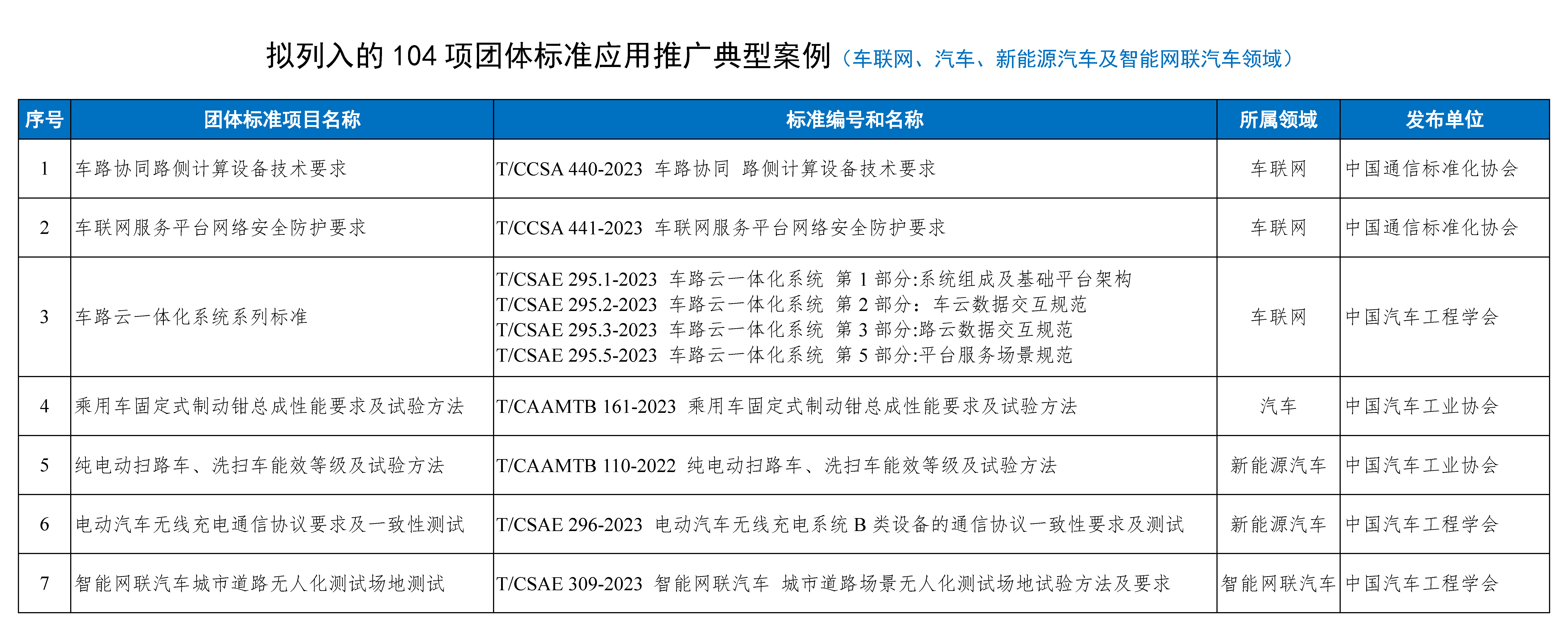 2024年12月30日,工业和信息化部科技司公开征求《人工智能训练服务器整机及集群系列标准》等104项团体标准应用推广典型案例的意见。其中,车联网、汽车、新能源汽车、智能网联汽车领域的团体标准拟列入2024年百项团体标准应用推广典型案例的有 7 项:车路协同路侧计算设备技术要求、车联网服务平台网络安全防护要求、车路云一体化系统系列标准、乘用车固定式制动钳总成性能要求及试验方法、纯电动扫路车 洗扫车能效等级及试验方法、电动汽车无线充电通信协议要求及一致性测试、智能网联汽车城市道路无人化测试场地测试。