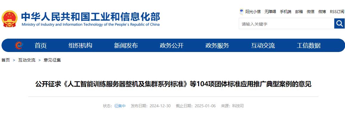 根据《工业和信息化部办公厅关于开展2024年工业和信息化百项团体标准应用推广典型案例遴选工作的通知》(工信厅科函〔2024〕257号)的程序和要求,经项目申报、形式审查、技术审查、专家论证、合规性审查等程序,拟将《人工智能训练服务器整机及集群系列标准》等104项团体标准列入2024年百项团体标准应用推广典型案例,现面向社会公开征求意见。如有意见或建议,请于2025年1月6日前反馈至工业和信息化部科技司,电子邮件发送至KJBZ@miit.gov.cn(邮件主题注明:2024年工业和信息化百项团体标准应用推广典型案例公开征求意见反馈)。