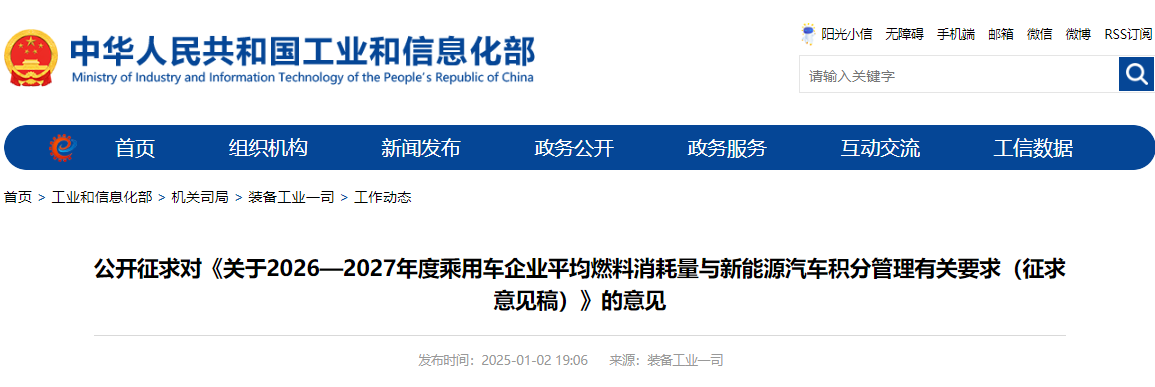 2025年1月2日,工业和信息化部公开征求对《关于2026—2027年度乘用车企业平均燃料消耗量与新能源汽车积分管理有关要求(征求意见稿)》的意见。