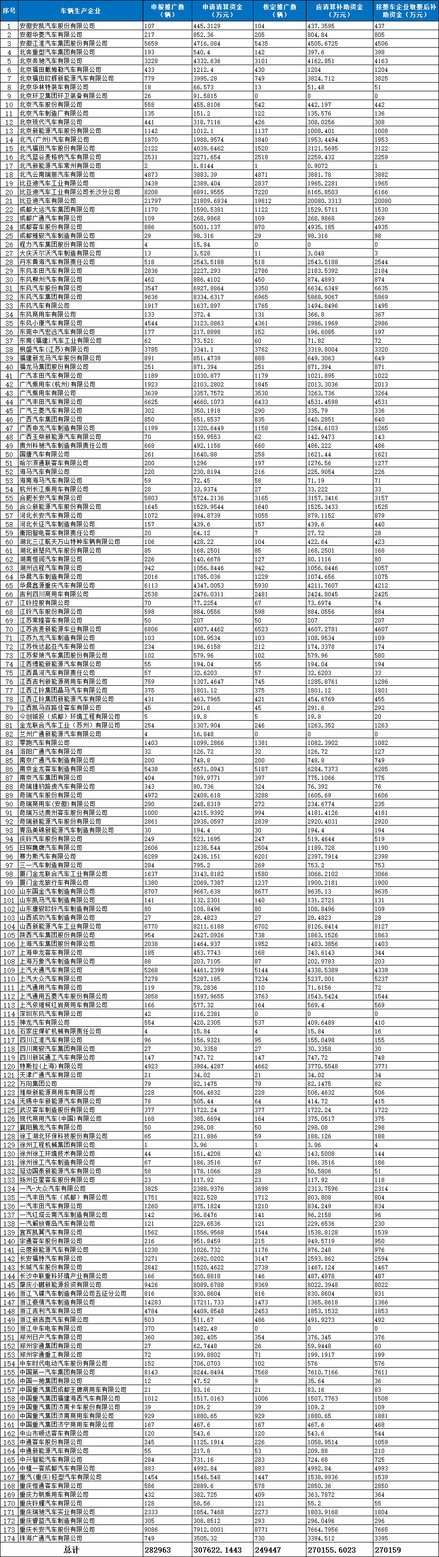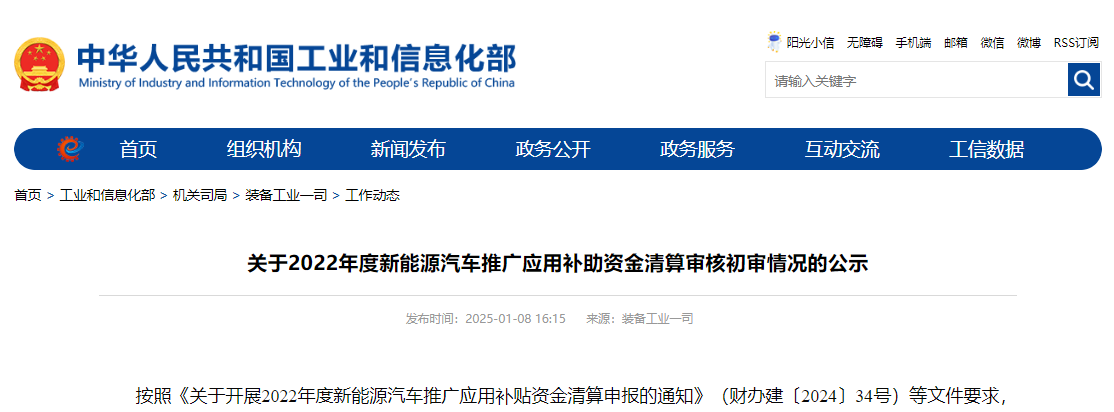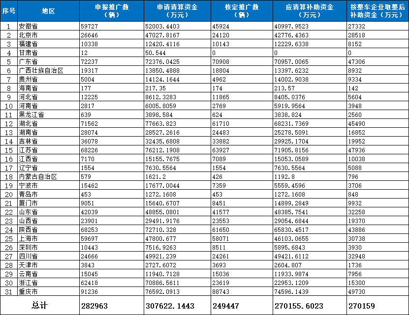 2025年1月8日,工业和信息化部装备工业一司公示2022年度新能源汽车推广应用补助资金清算审核初审情况。经统计,2022年度新能源汽车推广应用补助资金清算共涉及31个地区、174家企业,申报推广282963辆,申请清算资金307622.1443万元,核定推广249447辆,应清算补助资金270155.6023万元,按整车企业取整后补助资金270159万元。