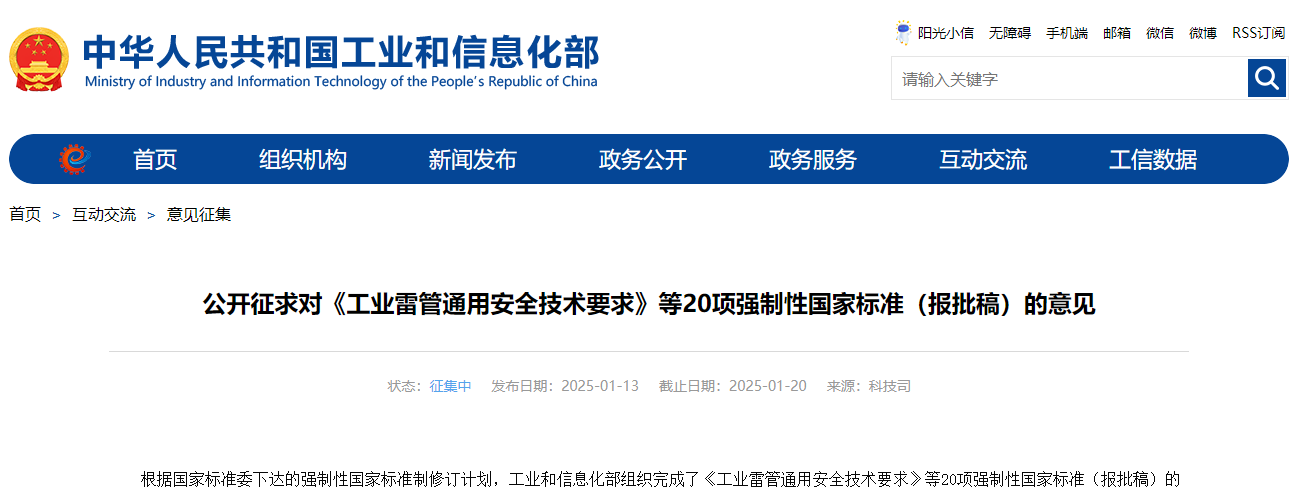 根据国家标准委下达的强制性国家标准制修订计划,工业和信息化部组织完成了《工业雷管通用安全技术要求》等20项强制性国家标准(报批稿)的编制工作。为进一步听取社会各界意见,现对标准报批稿及编制说明(见附件1、2)予以公示,截止日期2025年1月20日。