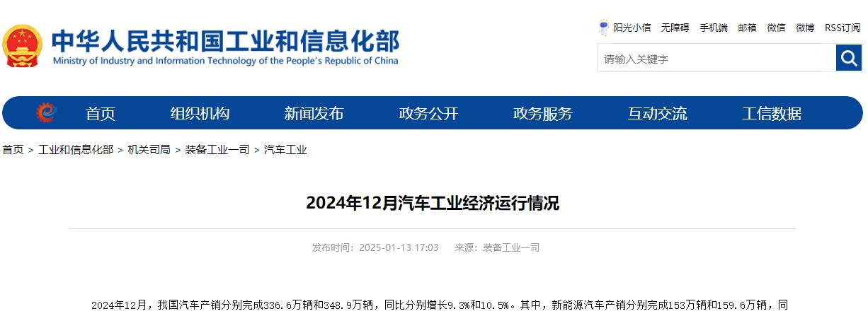 2024年12月,我国汽车产销分别完成336.6万辆和348.9万辆,同比分别增长9.3%和10.5%。其中,新能源汽车产销分别完成153万辆和159.6万辆,同比分别增长30.5%和34%。