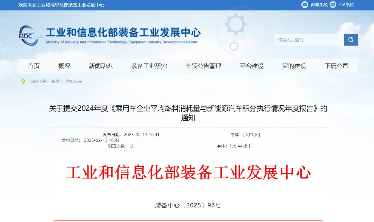工信部装备中心:关于提交2024年度《乘用车企业平均燃料消耗量与新能源汽车积分执行情况年度报告》的通知