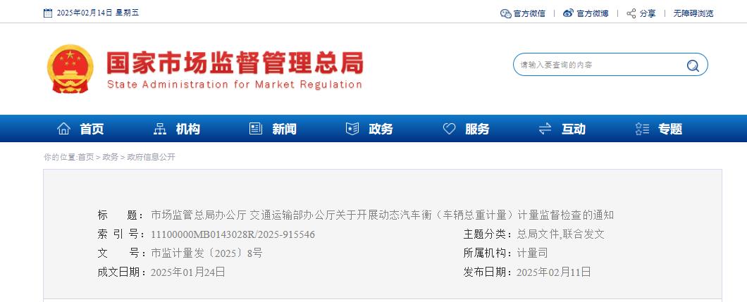 2025年2月11日,市场监管总局办公厅、交通运输部办公厅联合发布《关于开展动态汽车衡(车辆总重计量)计量监督检查的通知》(以下简称《通知》),《通知》明确:交通运输部、市场监管总局将于2025年2月至4月在全国范围内联合开展为期三个月的动态汽车衡(车辆总重计量)计量监督检查。推动优化动态汽车衡科学布点,规范动态汽车衡型式批准和强制检定工作,严厉打击破坏计量器具准确度等违法行为,切实维护公平有序的公路货运市场秩序。