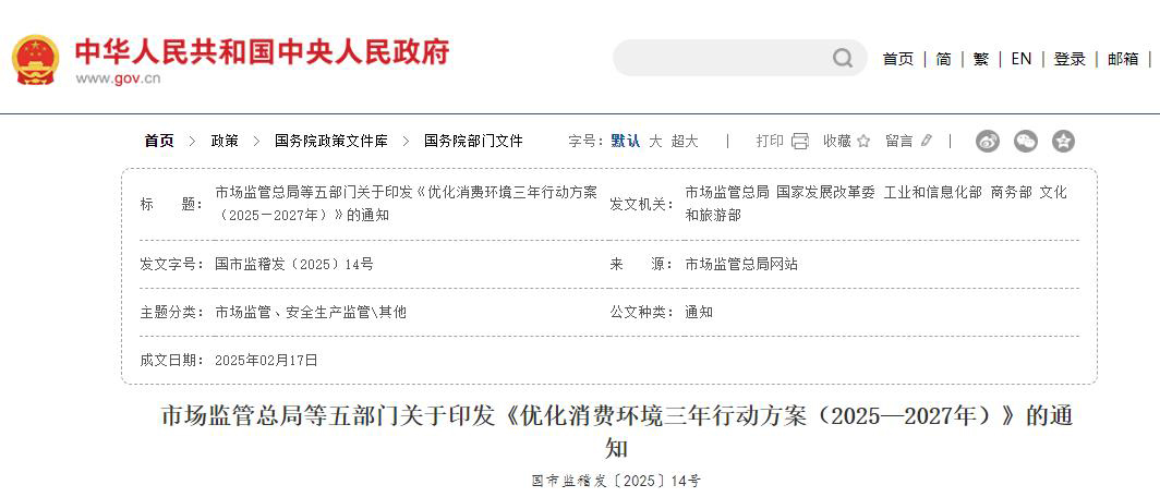 2025年2月19日,市场监管总局、国家发展改革委、工业和信息化部、商务部、文化和旅游部联合发布《优化消费环境三年行动方案(2025—2027年)》(以下简称《行动方案》),《行动方案》明确: