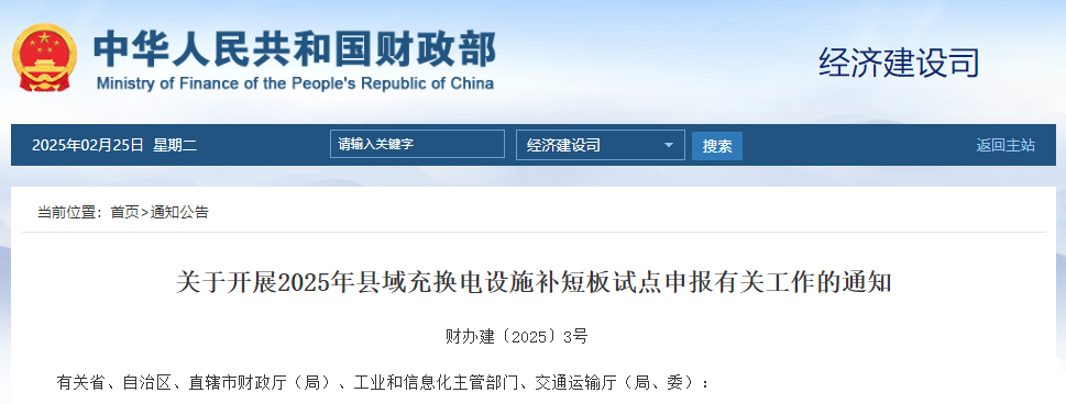 三部门:关于开展2025年县域充换电设施补短板试点申报有关工作的通知