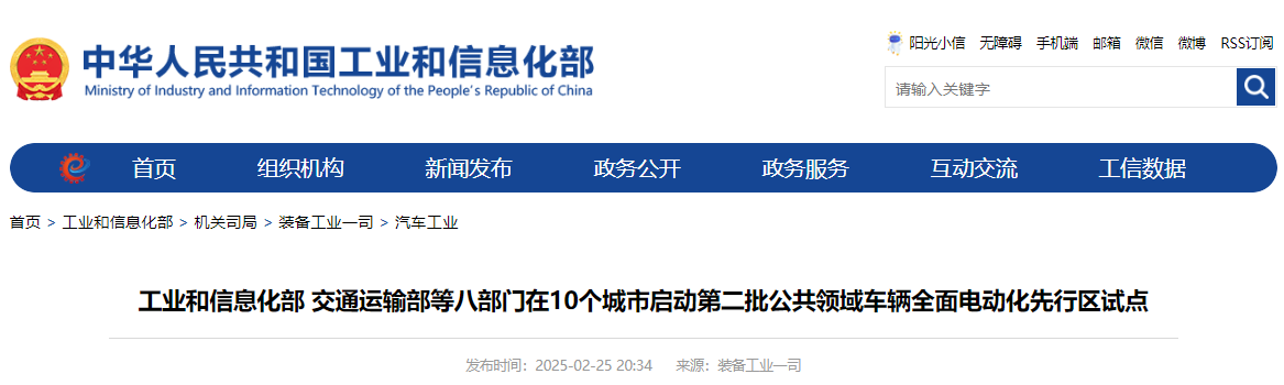 2023年2月3日,工信部装备工业一司发布《工业和信息化部等八部门关于组织开展公共领域车辆全面电动化先行区试点工作的通知》。