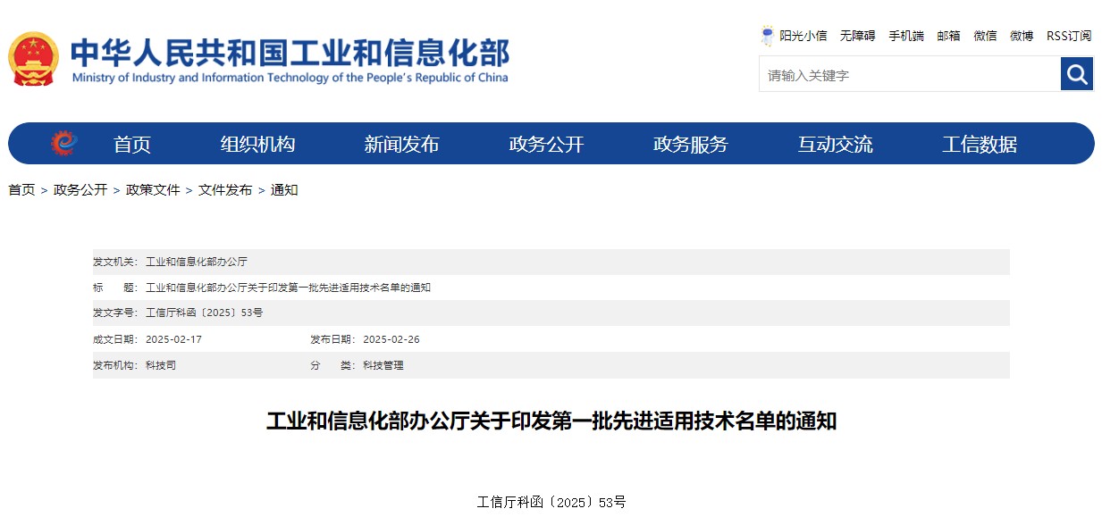 根据《工业和信息化部办公厅关于开展先进适用技术(第一批)遴选工作的通知》(工信厅科函〔2024〕398号),经自主申报、初审推荐、专家评审、公示等程序,形成了第一批先进适用技术名单,现予以公布。
