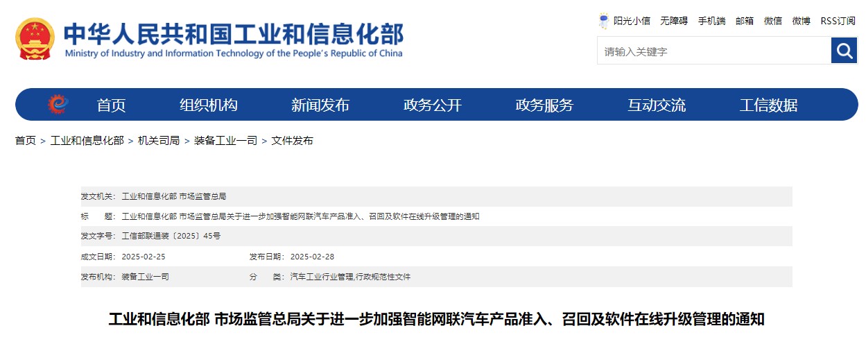 2025年2月28日,工业和信息化部、市场监管总局联合发布《关于进一步加强智能网联汽车产品准入、召回及软件在线升级管理的通知》(以下简称《通知》),《通知》明确:落实全国新型工业化推进大会部署和《质量强国建设纲要》,统筹发展和安全,坚持问题导向,强化管理协同,落实汽车生产企业生产一致性和质量安全主体责任,加强智能网联汽车产品准入和召回管理,进一步规范汽车生产企业OTA升级活动,提升智能网联汽车产品安全水平,维护公民生命、财产安全和公共安全,促进新技术规范应用,推动汽车产业高质量发展。
