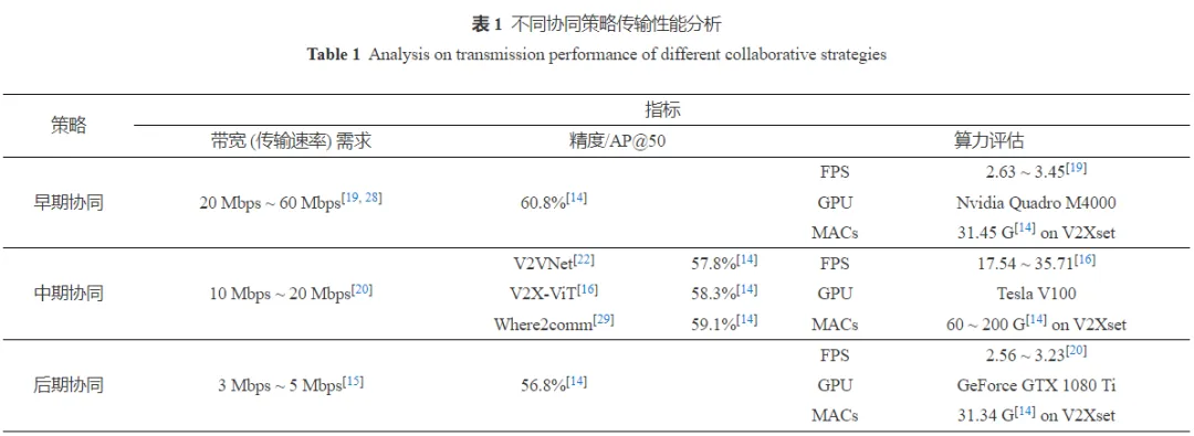 不同协同策略对带宽(传输速率)的需求、目标检测精度及算力评估,协同传输的类型为点云数据,精度评估以Dair-V2X数据集为基准,对目标检测的平均精度进行评估,通过GPU型号及推理速度:每秒帧数,同时结合Liu等在V2Xset数据集上实验得出的三种协同策略的乘加累积操作次数,对算力需求进行评估。