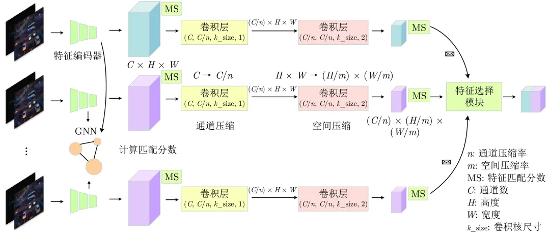 感知信息数据量过大会为传输过程带来负担,因此,研究者们通过对感知信息的选择和压缩来降低带宽负荷。感知信息的选择通常以图神经网络的方式完成,通过对图中节点之间的联系,即边的权重大小来对待传输的感知信息进行筛选。感知信息压缩的过程通常发生在传输之前,模型会对主干网络提取的特征信息进行压缩,经协同传输后在输出端解压缩。感知信息选择和压缩传输流程,即感知信息通过图神经网络计算相关度匹配分数,并在传输前进行通道及空间维度的压缩,传输过程中按照匹配分数选择强相关性的特征传输并融合。