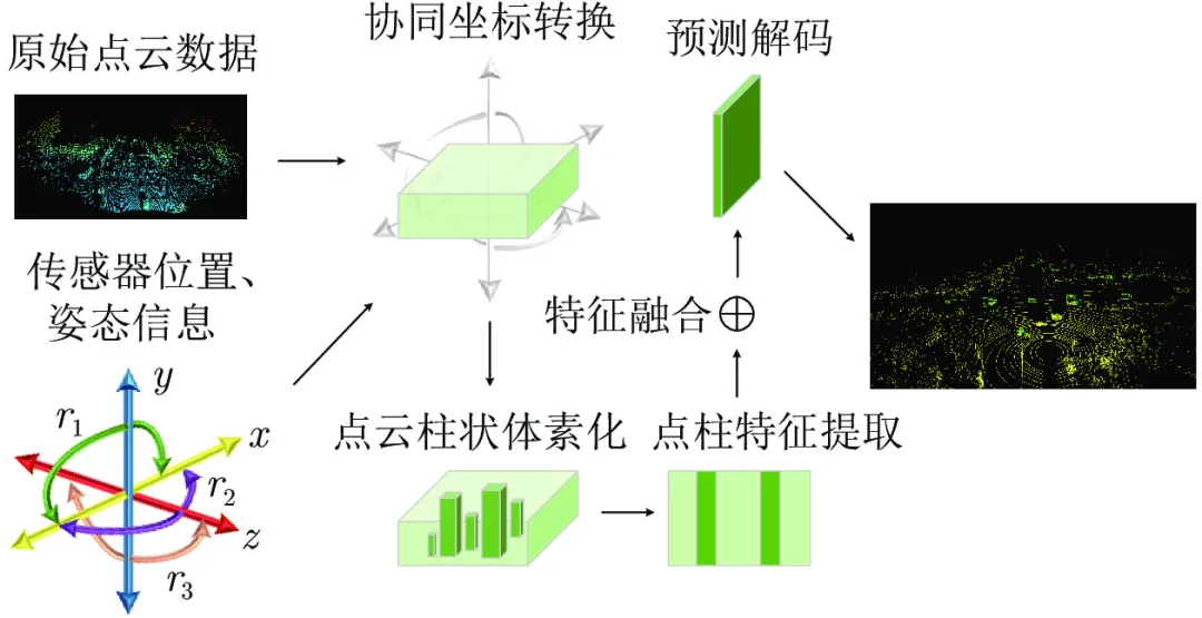 LiDAR是自动驾驶车辆常搭载的传感器之一,它可以提供丰富的空间信息,如位置、大小、方向等。点云数据的协同感知需要原始点云数据和各智能车辆或路端设备的传感器位姿信息,通过位姿信息对点云数据进行坐标转换、柱状化特征提取、融合与解码,从而进行协同感知预测。LiDAR生成的点云数据受外界光照条件影响小,比普通相机更能适应夜间等低光照场景,但远距离物体的点云数据非常稀疏, 并且被遮挡的物体返回的点云数量更少,这也导致LiDAR对远距离目标的检测性能和对遮挡情况的适应性较差。