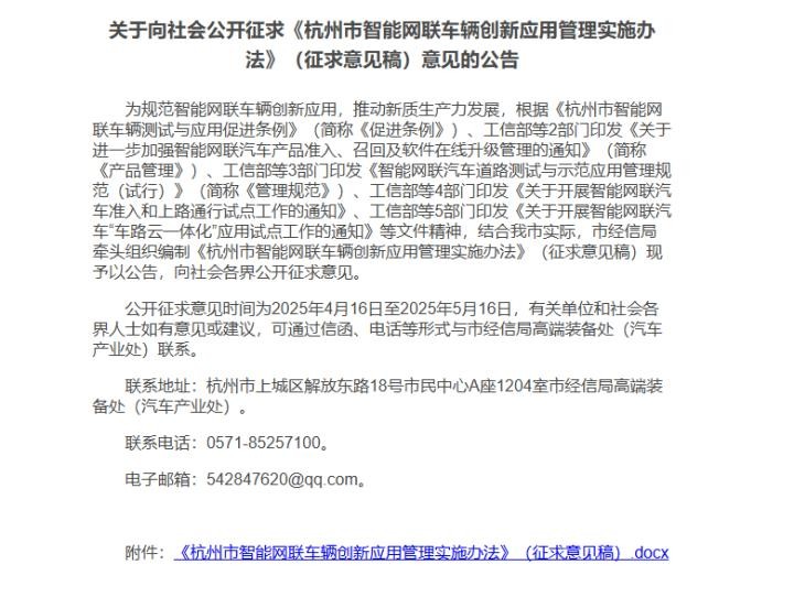 2025年4月16日,杭州市经济和信息化局发布《杭州市智能网联车辆创新应用管理实施办法(征求意见稿)》(以下简称《征求意见》),《征求意见》明确: