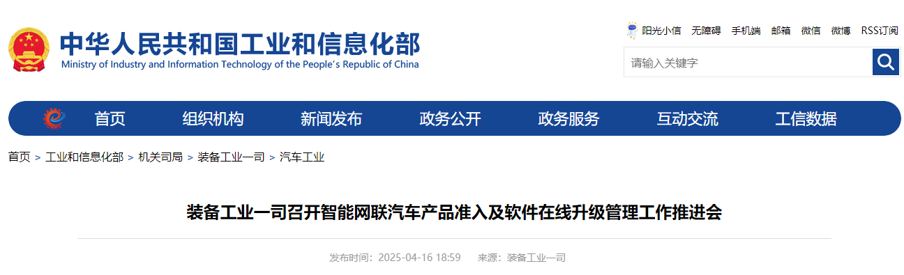 2025年4月16日,工业和信息化部装备工业一司组织召开智能网联汽车产品准入及软件在线升级管理工作推进会。部装备工业发展中心、主要汽车生产企业近60名代表参加会议。