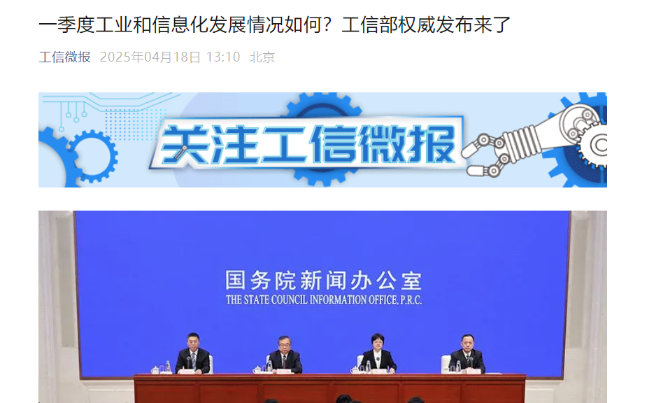 2025年4月18日,国务院新闻办公室举行新闻发布会,介绍2025年一季度工业和信息化发展情况。工业和信息化部新闻发言人、运行监测协调局局长陶青表示,今年一季度,在提振消费专项行动、“两新”加力扩围等相关政策的带动下,新能源汽车、智能制造装备等行业的内需潜力进一步激发,我国装备工业延续了去年以来持续回升向好的态势,实现了“行业整体稳步增长、细分行业亮点纷呈”的良好开局。