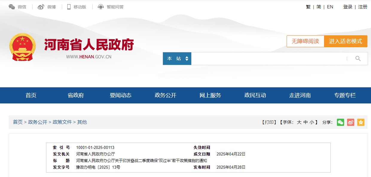 2025年4月28日,河南省人民政府办公厅发布《奋战二季度确保“双过半”若干政策措施》(以下简称《措施》),《措施》明确: