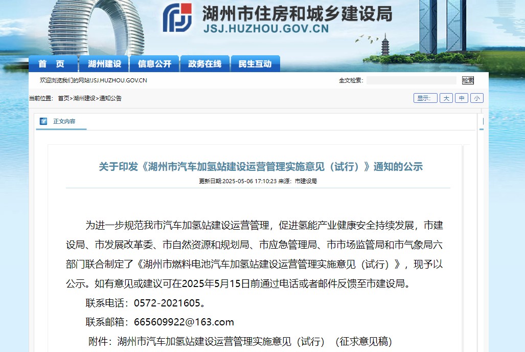 2025年5月6日,湖州市住房和城乡建设局发布《湖州市汽车加氢站建设运营管理实施意见(试行)征求意见》,《征求意见》明确:除仅供自用外的其他加氢站外,从事经营活动的企业应当按照“一站一证”的原则,依法取得燃气经营许可证(汽车加氢站),应具备相关条件。加氢站经营企业申请燃气经营许可证(汽车加氢站),应当向燃气主管部门提交相关材料。