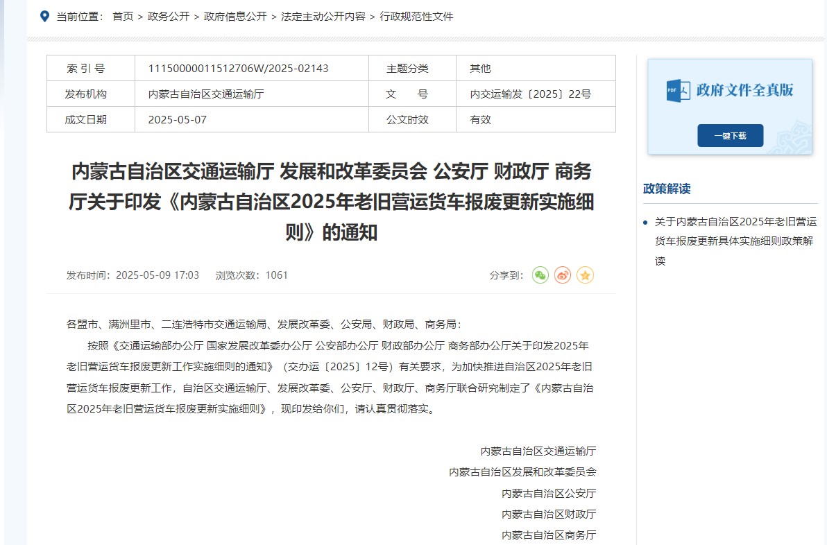 2025年5月9日,内蒙古自治区交通运输厅、发展和改革委员会、公安厅、财政厅、商务厅联合发布《内蒙古自治区2025年老旧营运货车报废更新实施细则》(以下简称《细则》),《细则》明确: