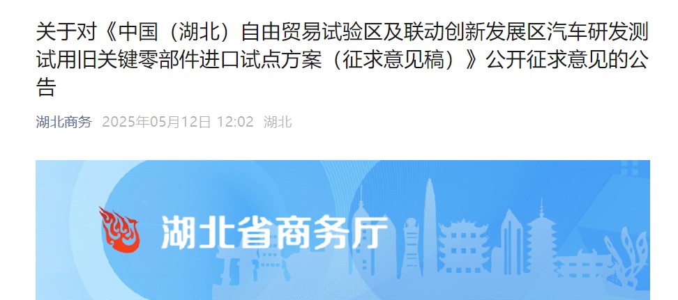 为更好发挥中国(湖北)自由贸易试验区及联动创新发展区先行先试作用,在风险可控的前提下,推动汽车研发测试用旧关键零部件进口试点工作,提升汽车企业研发能力,增强产品国际竞争力,助力打造万亿级汽车产业集群,2025年5月12日,湖北省商务厅发布《中国(湖北)自由贸易试验区及联动创新发展区汽车研发测试用旧关键零部件进口试点方案(征求意见稿)》(以下简称《征求意见》),《征求意见》明确:建立“试点清单”制度,采用“试点清单”方式发布试点企业和试单产品。“试点清单”包括试点企业、试点产品等内容,试点企业与试点产品“一一对应”,原则上每半年动态调整1次。