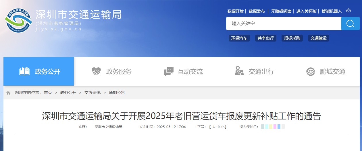 深圳市交通运输局于5月12日发布《关于开展2025年老旧营运货车报废更新补贴工作的通告》(以下简称《通告》)。《通告》明确: