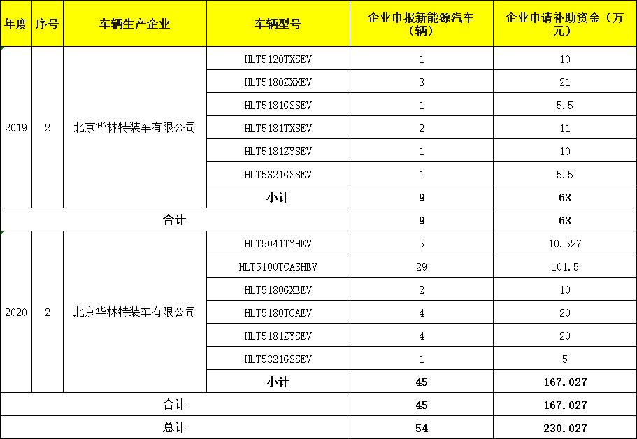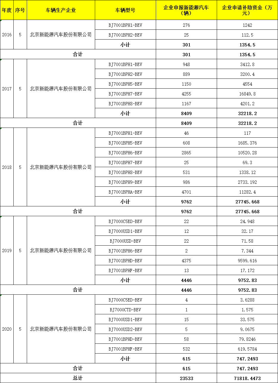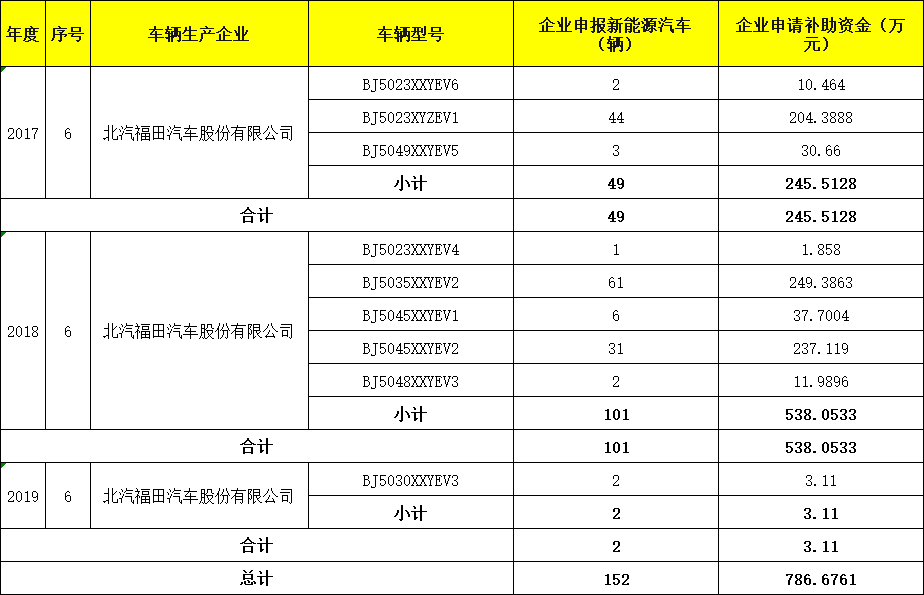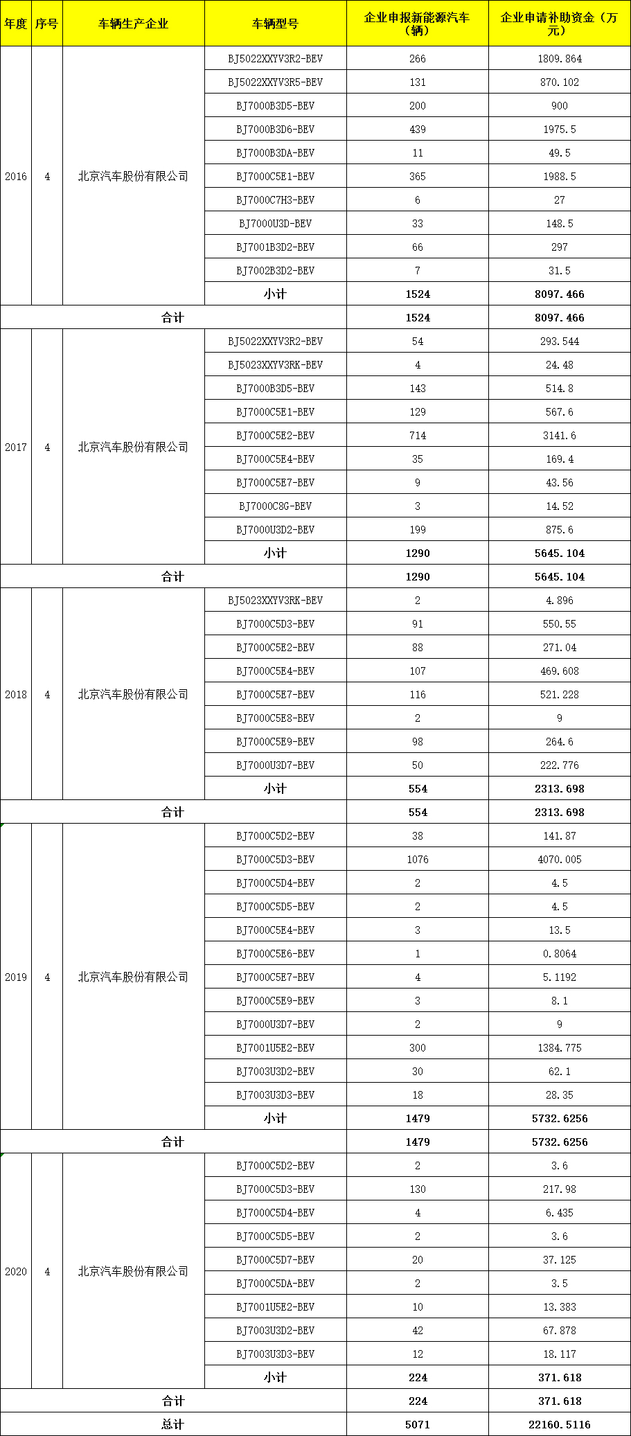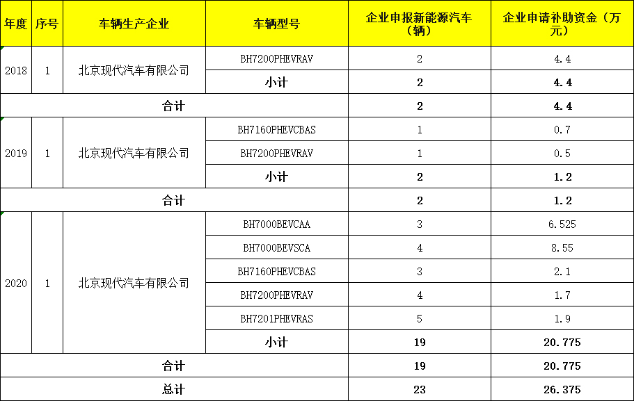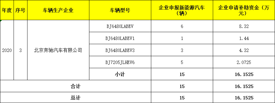 2)北京现代汽车有限公司申报新能源汽车23辆,申请补助资金26.375万元;北京华林特装车有限公司申报新能源汽车54辆,申请补助资金230.027万元;北京奔驰汽车有限公司申报新能源汽车15辆,申请补助资金16.1525万元;北京汽车股份有限公司申报新能源汽车5071辆,申请补助资金22160.5116万元;北京新能源汽车股份有限公司申报新能源汽车23533辆,申请补助资金71818.4473万元;北汽福田汽车股份有限公司申报新能源汽车152辆,申请补助资金786.6761万元。