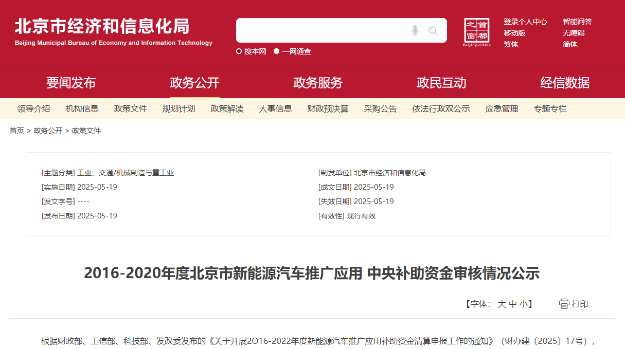 2025年5月19日,北京市经济和信息化局发布《2016-2020年度北京市新能源汽车推广应用 中央补助资金审核情况公示》(以下简称《公示》),《公示》明确: