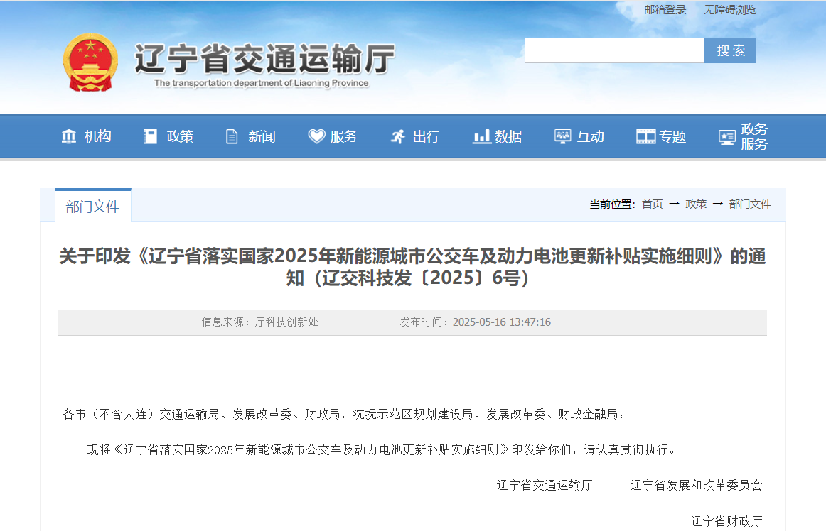 辽宁省落实国家2025年新能源城市公交车及动力电池更新补贴实施细则