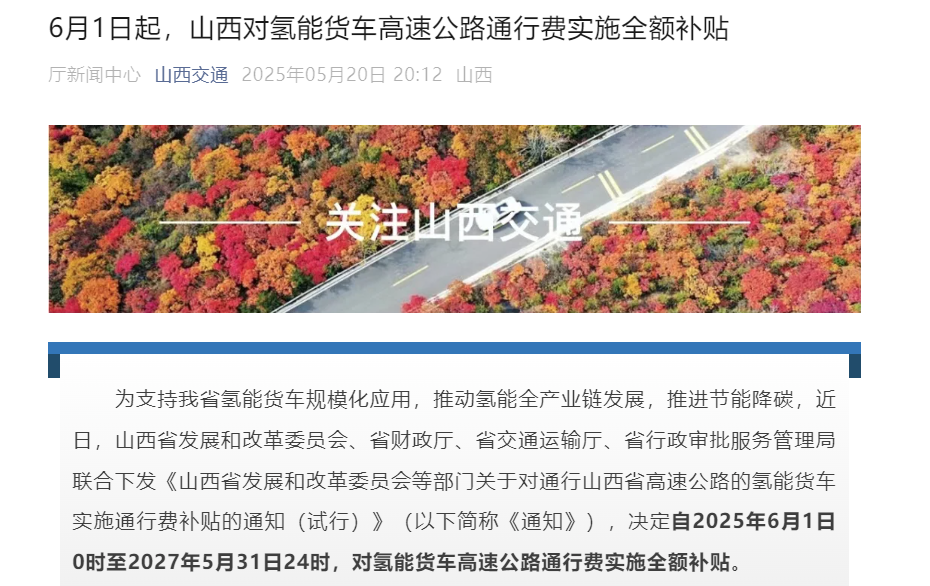 6月1日起,山西对氢能货车高速公路通行费实施全额补贴