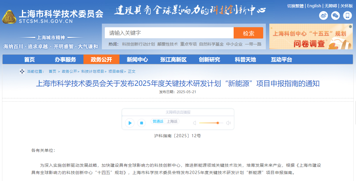 上海市科学技术委员会发布《关于发布2025年度关键技术研发计划“新能源”项目申报指南的通知》,《通知》明确了项目网上填报起止时间:2025年5月29日9:00至2025年6月18日16:30(含申报单位网上审核提交)。氢能相关方面,征集范围涵盖: