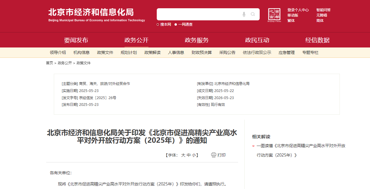 北京市促进高精尖产业高水平对外开放行动方案(2025年)