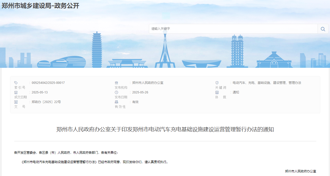 2025年5月26日,郑州市人民政府办公室发布《郑州市电动汽车充电基础设施建设运营管理暂行办法》(以下简称《办法》),《办法》明确: