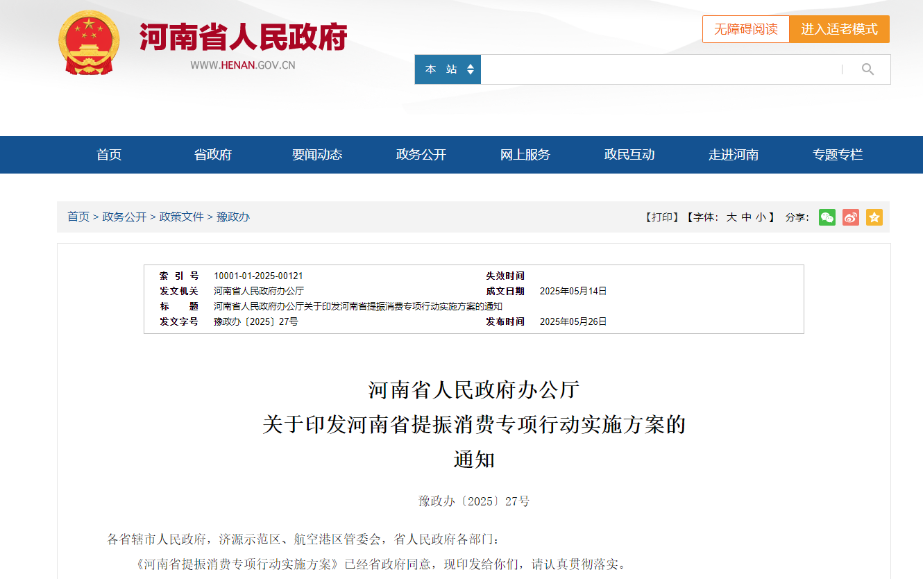 2025年5月26日,河南省人民政府办公厅发布《河南省提振消费专项行动实施方案》(以下简称《方案》),《方案》明确: